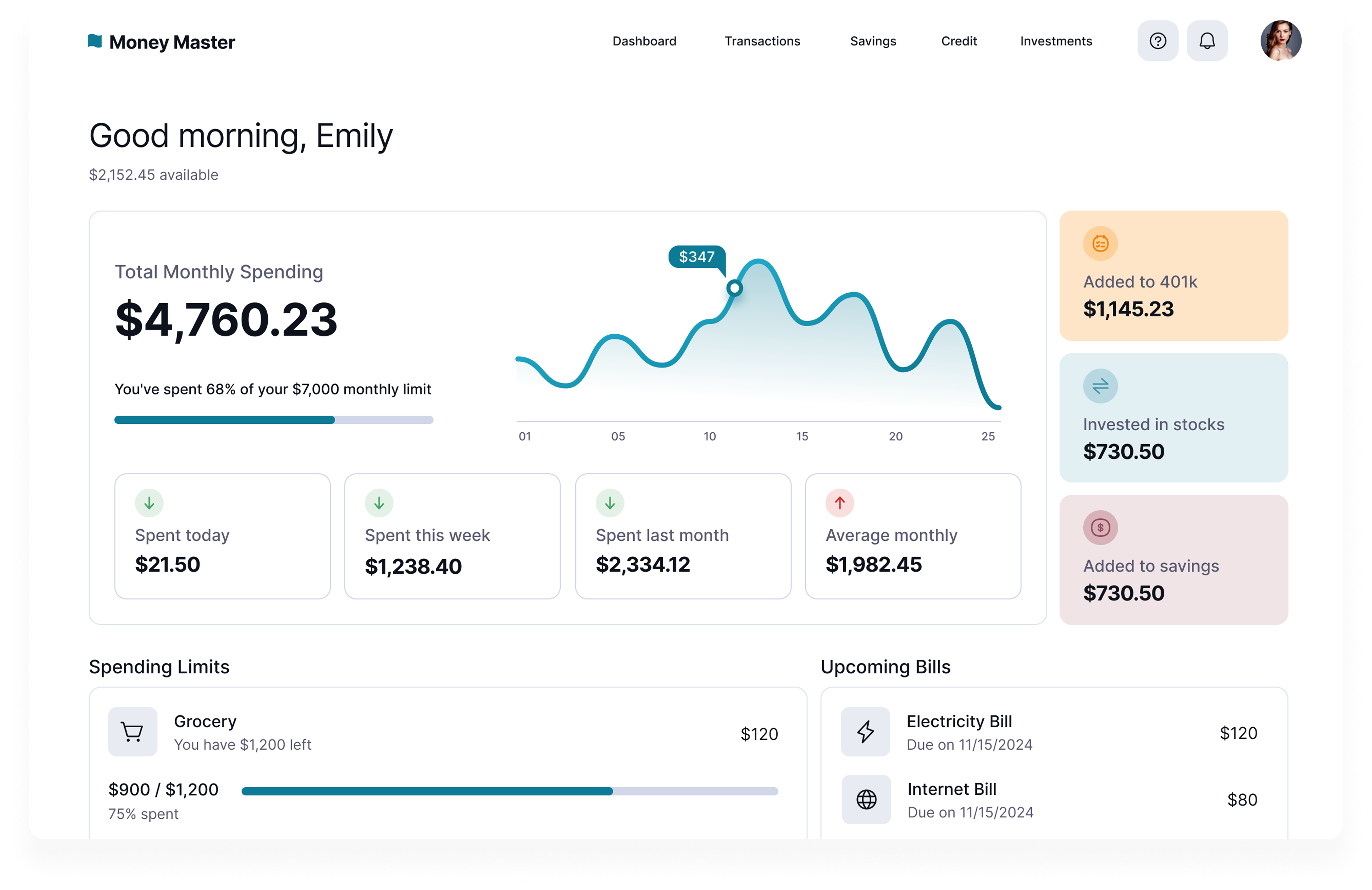 Money Master is a conceptual personal finance web app designed to help users make sense of their spending, saving, and investing habits—without feeling overwhelmed. The goal was to create a dashboard that delivers powerful financial insights in a visual, approachable way.